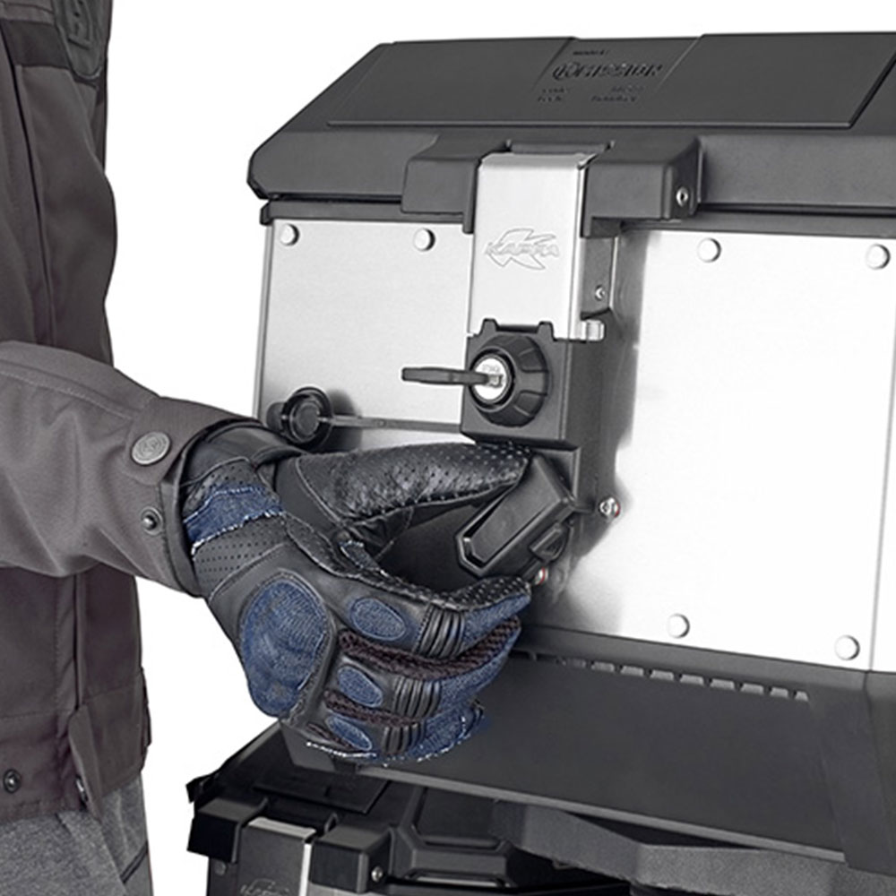 KAPPA K’MISSION aluminijumski vodootporan kofer kapaciteta 44 L opremljen sa MONOKEY® sistemom koji vam omogućava da sa jednim ključem otvorite i skinete kofer sa ploče.