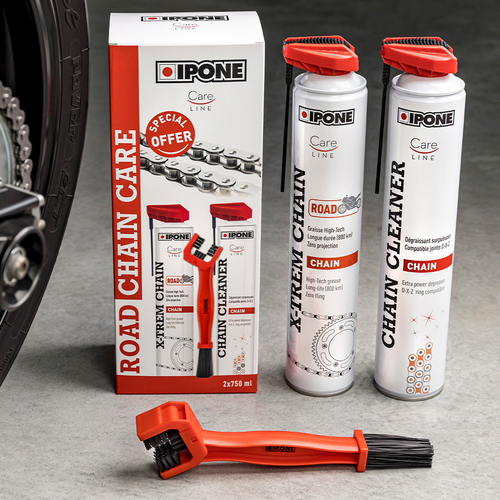 Namenjen je za sve tipove lanca O-X-Z (ring) na motociklima.Sastav formule Ipone X-Tream Chain Road je baziran na masti sa kalcijum sulfatom i aditivima koji garantuju smanjenje trenja i gubitak snage. Dizajniran je tako da se zadržava na lancu pri velikim brzinama i visokim temperaturama. Otporan je na vodu, sprečava stvaranje korozije. Upotrebom spreja smanjuje se istezanje i produžava radni vek lanca i lančanika. Podesiva mlaznica obezbeđuje precizno nanošenje spreja. Ima visoku otpornost u ekstremnim uslovima, a na lancu se zadržava i do 800 km.